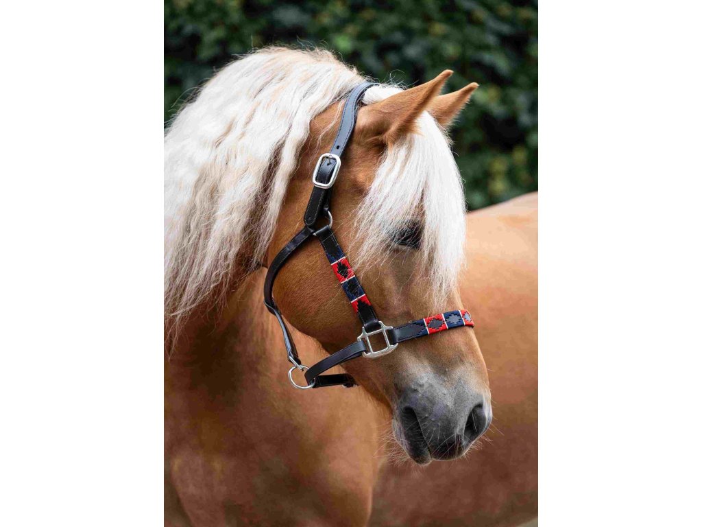 Kožená ohlávka s anatomicky tvarovanou, mäkko polstrovanou čelenkou a elegantným vyšívaným vzorom.