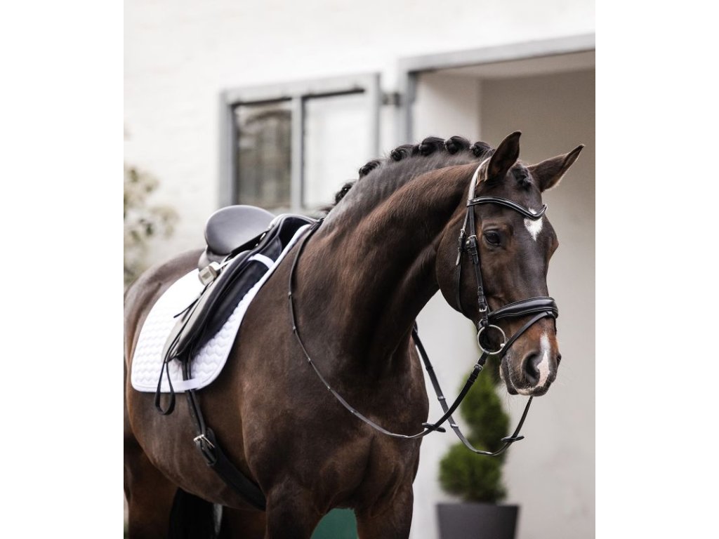 Klasická sedlová dečka s elegantným a neobvyklým prešívaním. Pútka na sedlo sa otvárajú pomocou suchého zipsu. Podšívka zaisťuje dobrú absorpciu potu, výplň 280 g/m² a 10 mm peny zabezpečujú vynikajúce vyrovnanie tlaku.